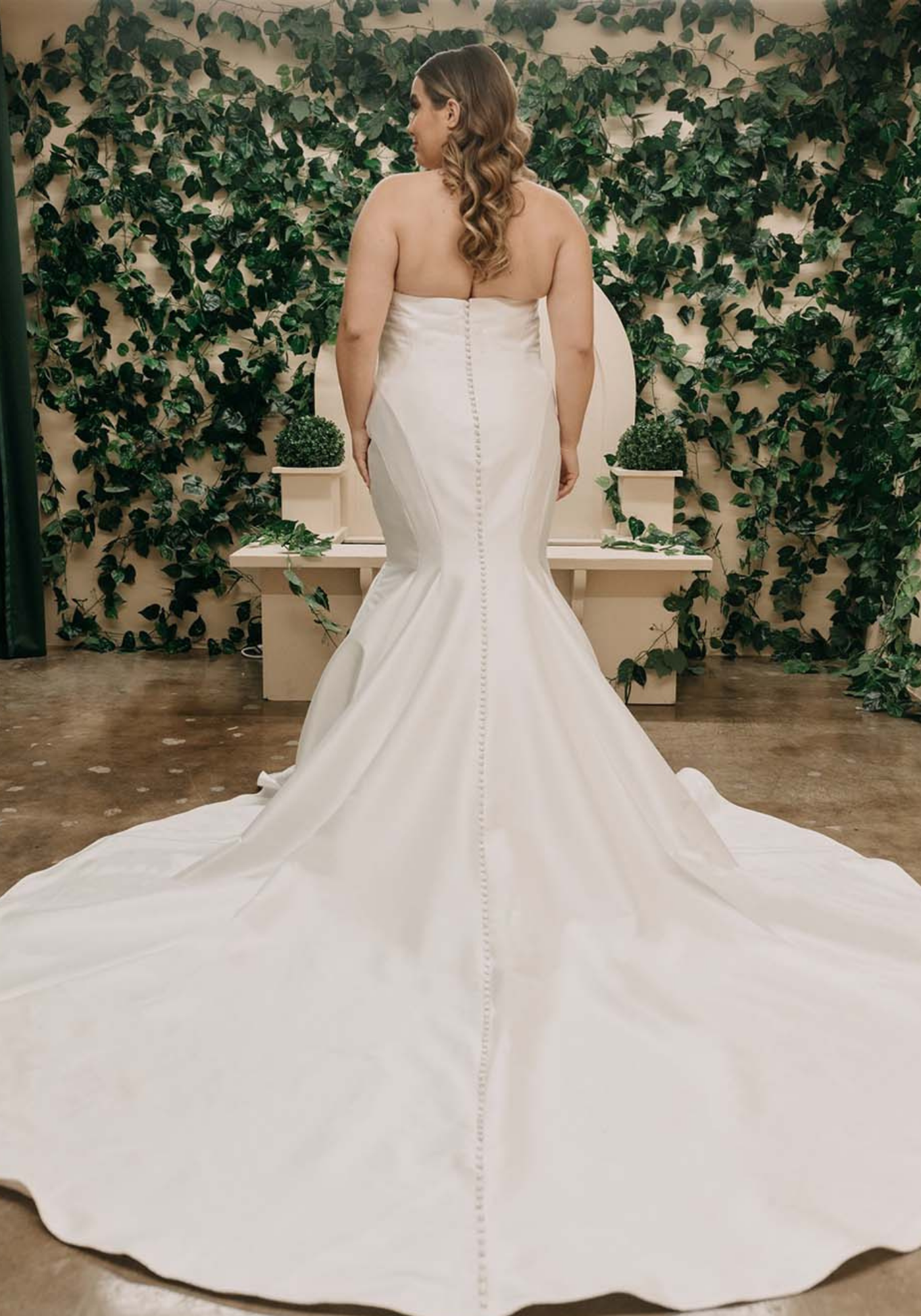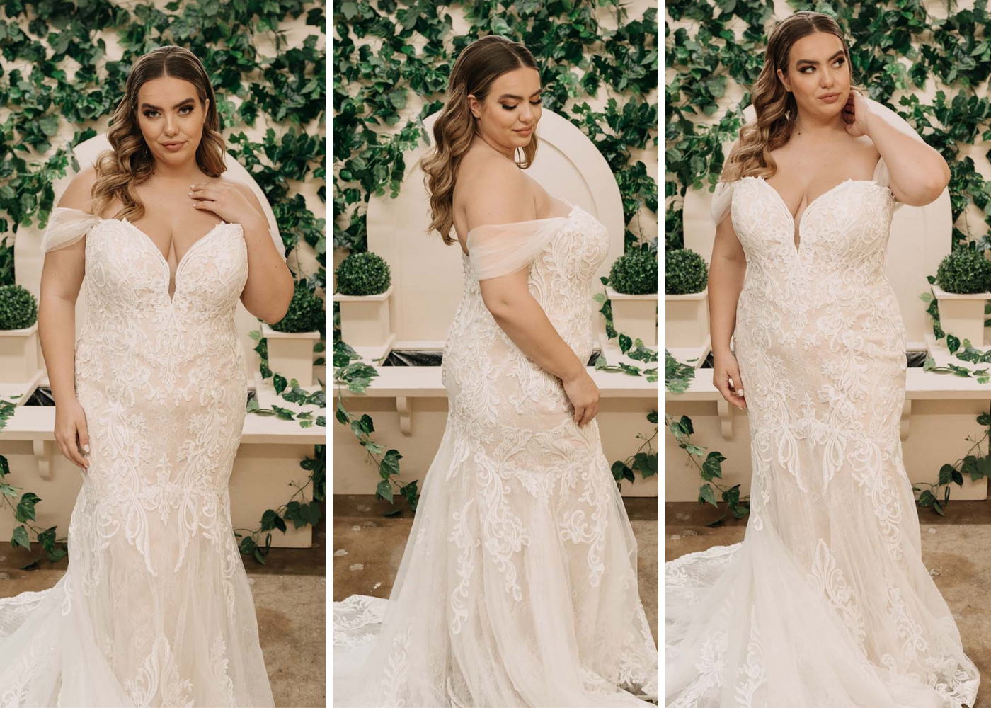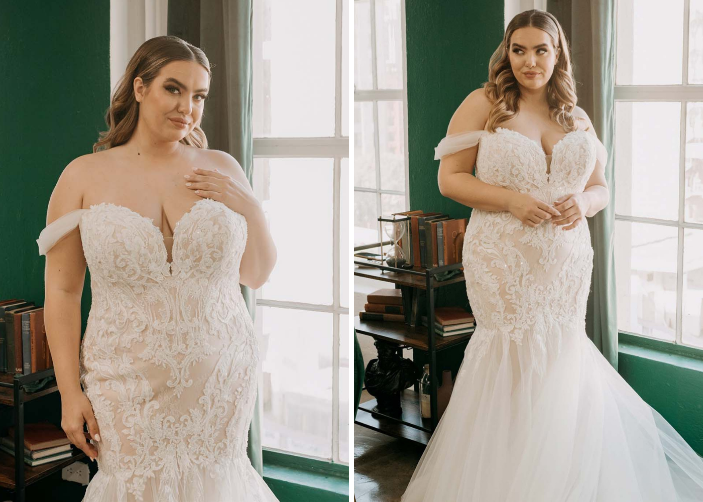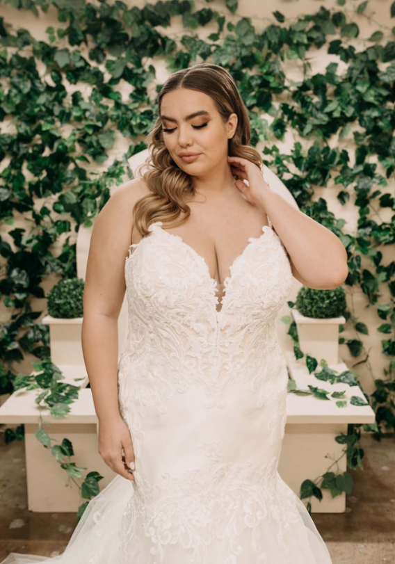 The gown we all know and love... FRANÇOISE X Édition! Her unique neckline, the deep side cut-outs, and the double sculpted lace train are just a few of the details that make this gown super flattering on every body.