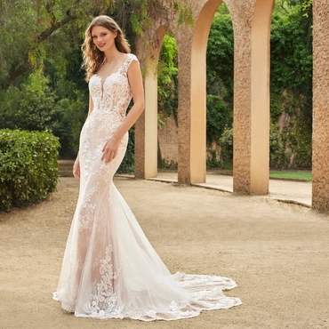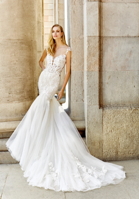 For brides who want a sweet and flirty bridal look, CALIE is the dress you need for your wedding day. CALIE is an all-over lace gown with gorgeous lace designs trailing throughout the bodice and the signature ÉLYSÉE sculpted train.