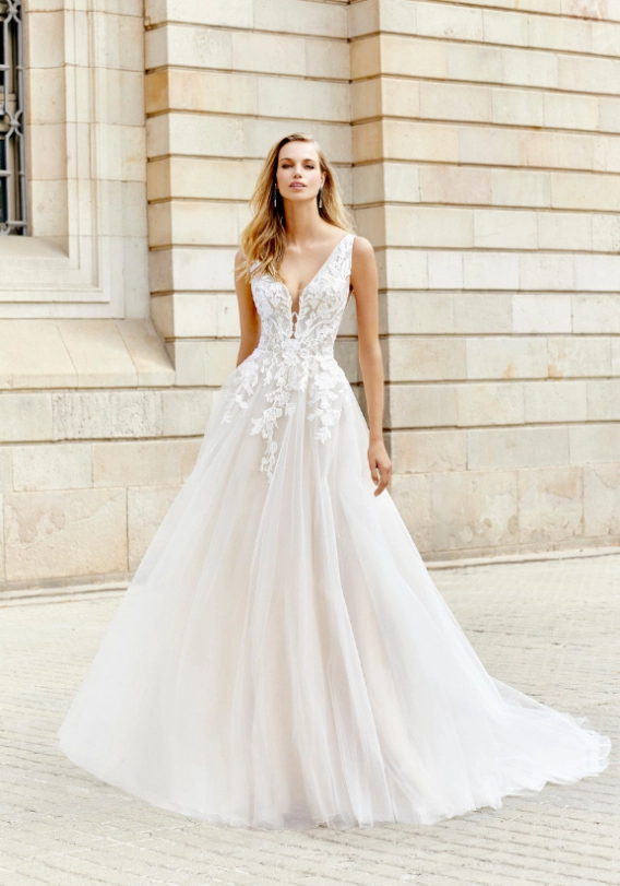 SOLEIL is a super romantic gown with a sweet boho touch. She has a sexy, plunging V-neckline and sparkling floral lace that flows down into the dreamiest tulle skirt.