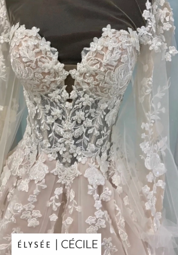 I love CÉCILE. Ok i said it she is a ball gown but she's got magic and she is magic in those sleeves. The sleeves are removable; they are fitted sleeves with a blue type of sleeve over top, it can completely come off. I love the shape of this ball gown. It’s a little bit of a unicorn shape. There's kind of more of a drop waist effect to it, so it’s going to be really super flattering for any body type. Really show off waist detail a little bit more cinched in, but just super duper soft and romantic. I love that the style to be a ball gown has a lower back that’s not really something you see real often, but it has much structure in the top. It works and it is just gorgeous personified...CÉCILE. Chef’s kiss i love you so much.