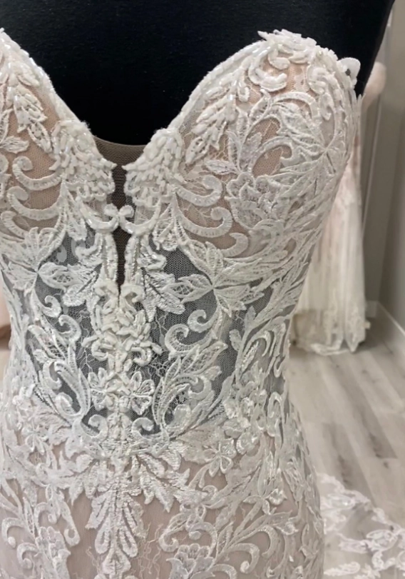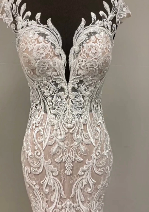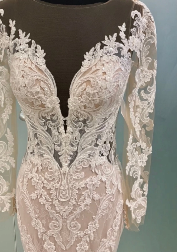 Alright who wants to look like royalty because in this style she outta. I love the long sleeves, I love the heavy lace. It’s just super detailed, it's super outrageous. So gorgeous, super plunging low neckline we have that sheer in the bodice little bit of those dip side cutouts through the hips. It’s just super body contouring. I love that the train on this style is still really WOW but it is actually a little bit more so it's not so long she outta she's got it she’s a 10.