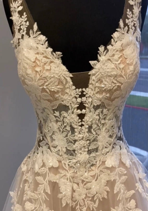 Meet gorgeous INÉS. Again we have this kind of textural mosh of thicker floral lace, softer more delicate lace. I just love this layered effect, it just adds so much drama and then leading down to a really gorgeous A-line tulle skirt that's super soft, super romantic. Love this kind of back that has a little bit of lower detail with the scalloping around the edges. The neckline on this style is outstanding. We have our side cutouts again so just very body contouring, very flattering, very romantic, got a beautiful twinkle. INÉS is a showstopper comin’ and goin’ but she’s very soft. UGH look at the detail i love it. INÉS you're gorgeous.