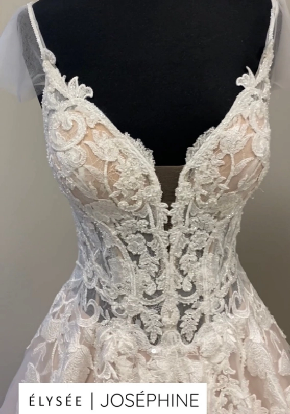 Alright, here is beauty JOSÉPHINE and I love this style because she’s kind of like a classic A-line but with a lot of modern touches. And one thing I really love is there is um a little spaghetti strap, but there's actually little detachable tulle bell sleeves which just adds a little bit of texture, a little bit more soft, romantic, the dress itself though is just not to be out done in the back, there is this low V. Very sexy, but very romantic and sweet.