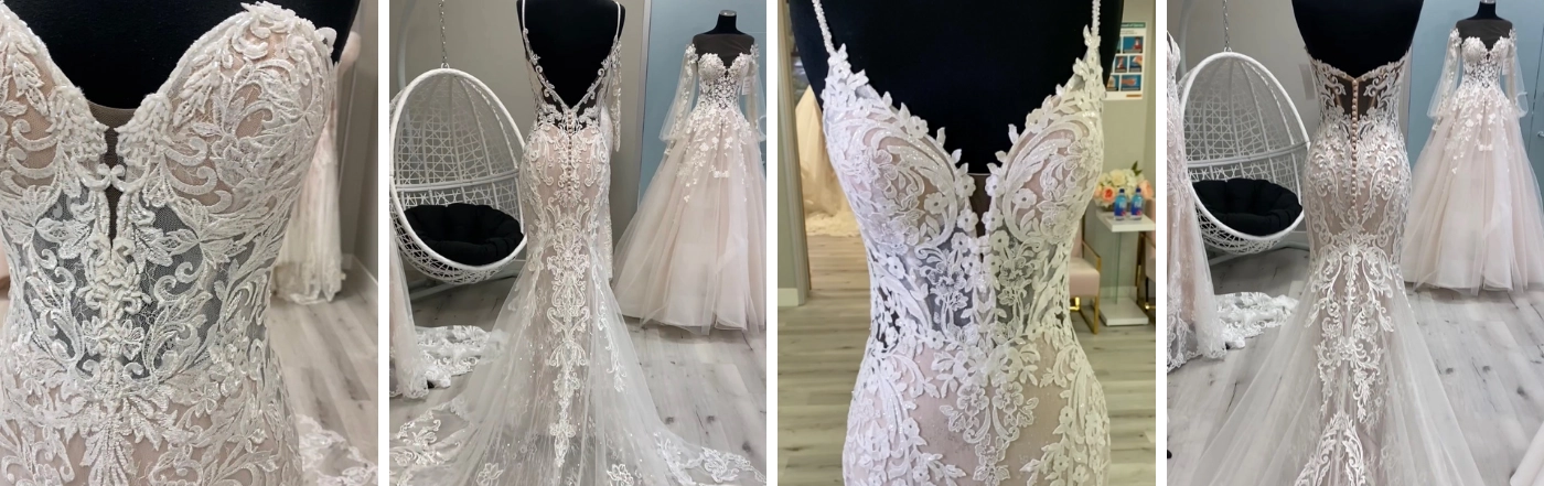 "And here we have fan favorite, ANAÏS. This style is so regal but so soft and so romantic. I love. Again, we have that layered lace effect. Just very, very heavily laced on this style. I love the illusion bodice, I love the side cut-outs, but I especially love this train. Check out the lace detail on this style. It’s just so layer, upon layer, upon layer of detail. So gorgeous to look at. Just really a delight for the eyes. ANAÏS. She is gorgeous. Such a stunner. So romantic, but a WOW. 10 out of 10. ANAÏS."