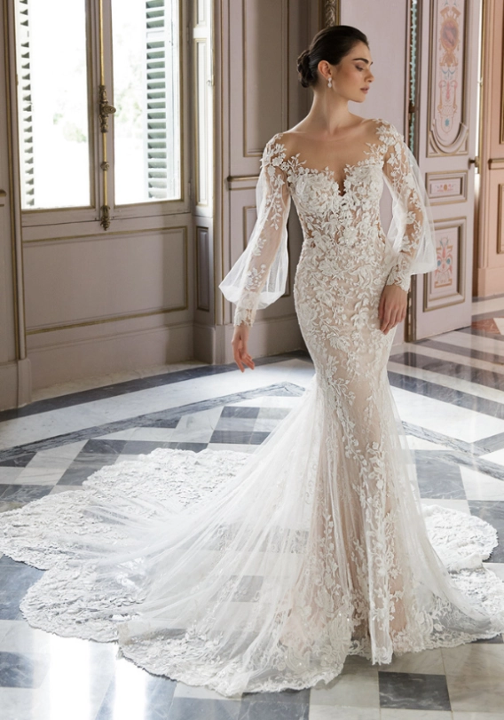 Next is our super glamorous LOUVECIENNES gown! She has an illusion sweetheart neckline for a super romantic, classic look that perfectly balances sexiness and coverage (for the cold, of course!). Her delicate, long illusion lace sleeves are perfect for creating that timeless bridal style... and providing some extra warmth!