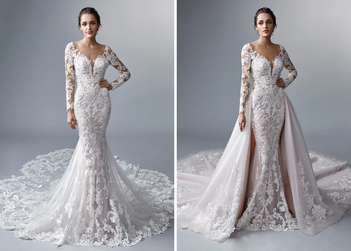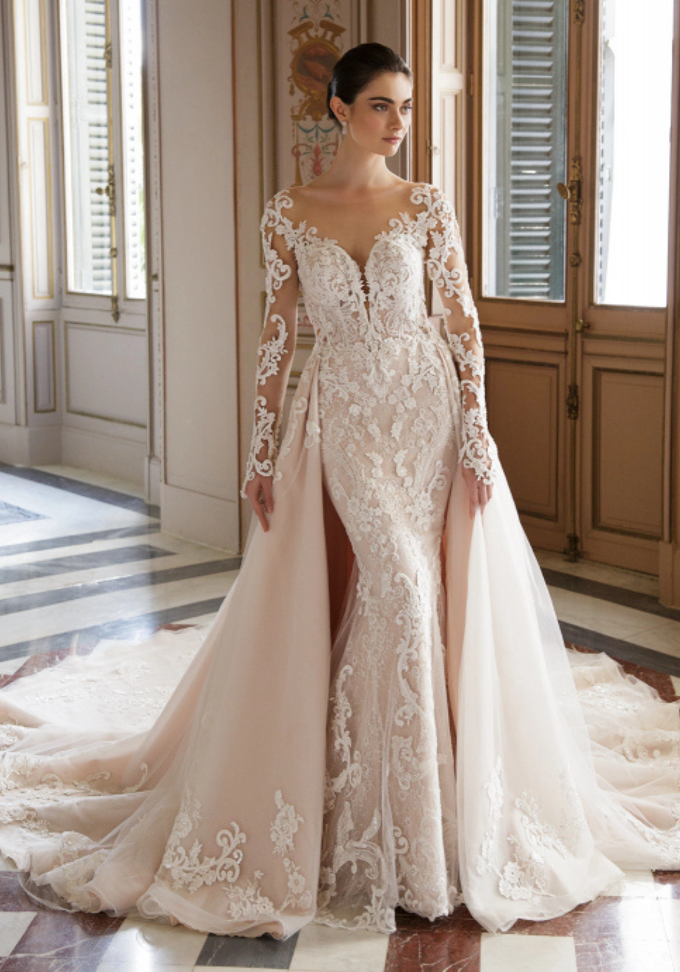 LOUVRE oozes regal sophistication with her plunging sweetheart neckline, long lace sleeves with fashion-forward extended cuffs, and a voluminous, detachable A-line overskirt. Guaranteed to bring the WOW factor!