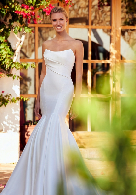 Seraphine is contemporary minimalism and glamour, perfected. A clean, sleek Mikado gown that provides support for a body-contouring and figure-flattering style without forsaking comfort. The slightly scooped neckline and low V-back is a modern and sexy feature that balances with the mesmerizing full skirt. Covered buttons trailing down to the hem of the gown add a sweet, detailed finishing touch.