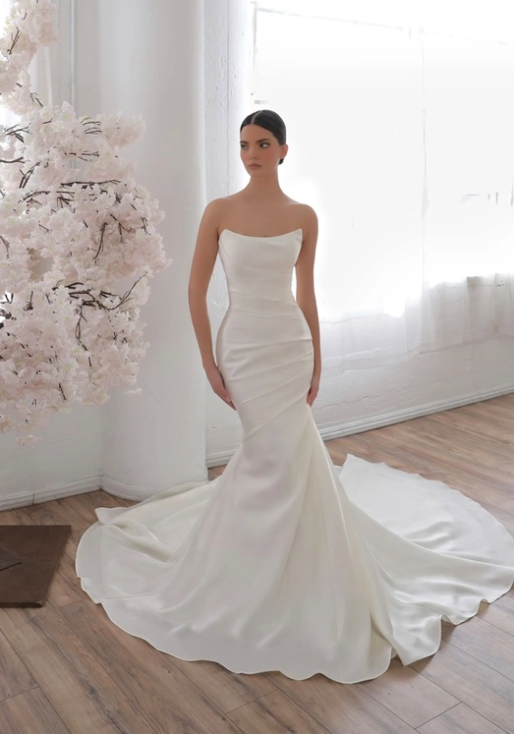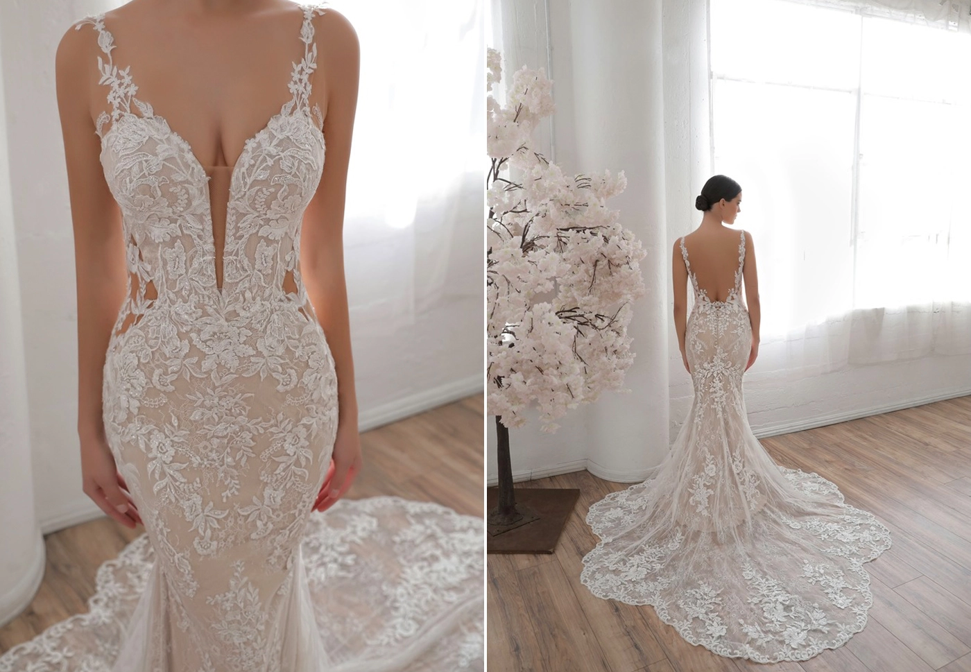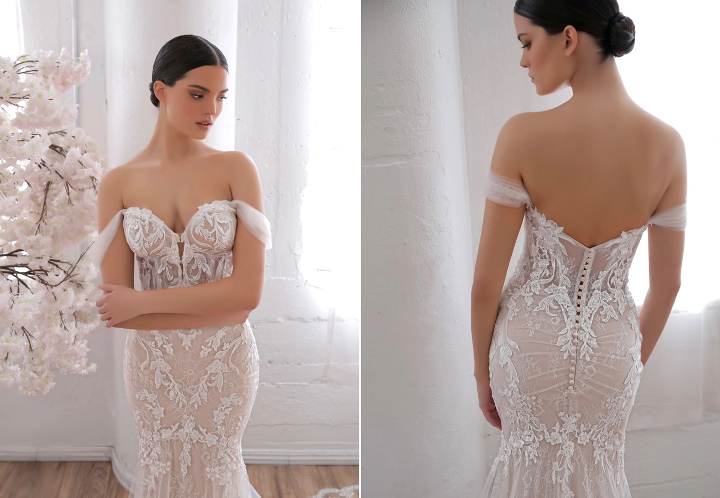 Oh, sweet Evangeline. A popular gown on social and a Designers’ Choice for her delicate details. Perfect lace placement on Evangeline sculpts, supports and contours the body wonderfully allowing you to shine on your dream day. Detachable off-shoulder straps are a romantic and versatile element detail on this mermaid gown.
