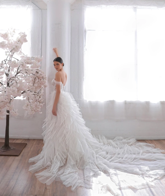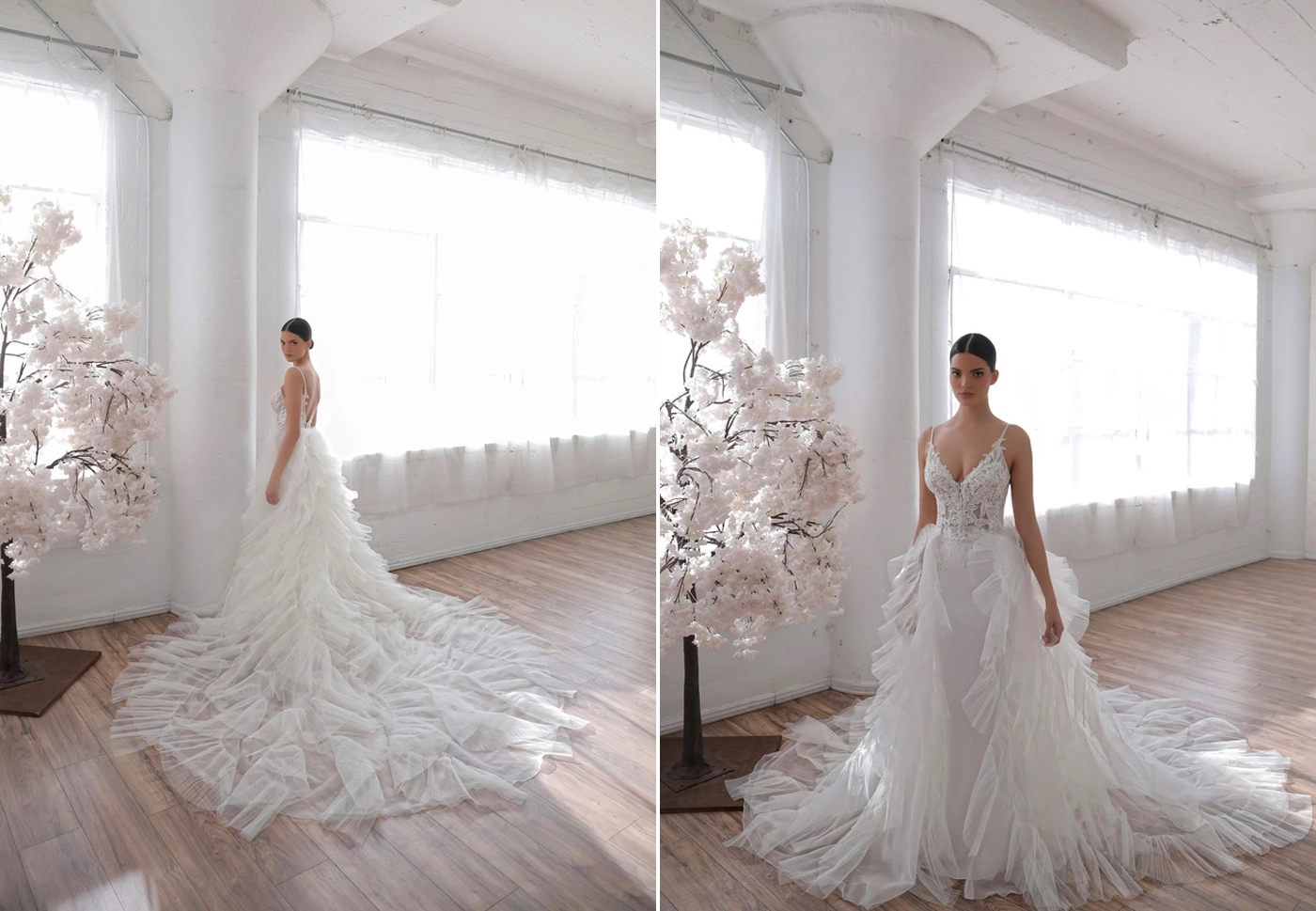 Here Evangeline has been paired with the Delphine overskirt. Float on air with this beautiful ruched tulle skirt and then reveal your second look in time to dance the night away!