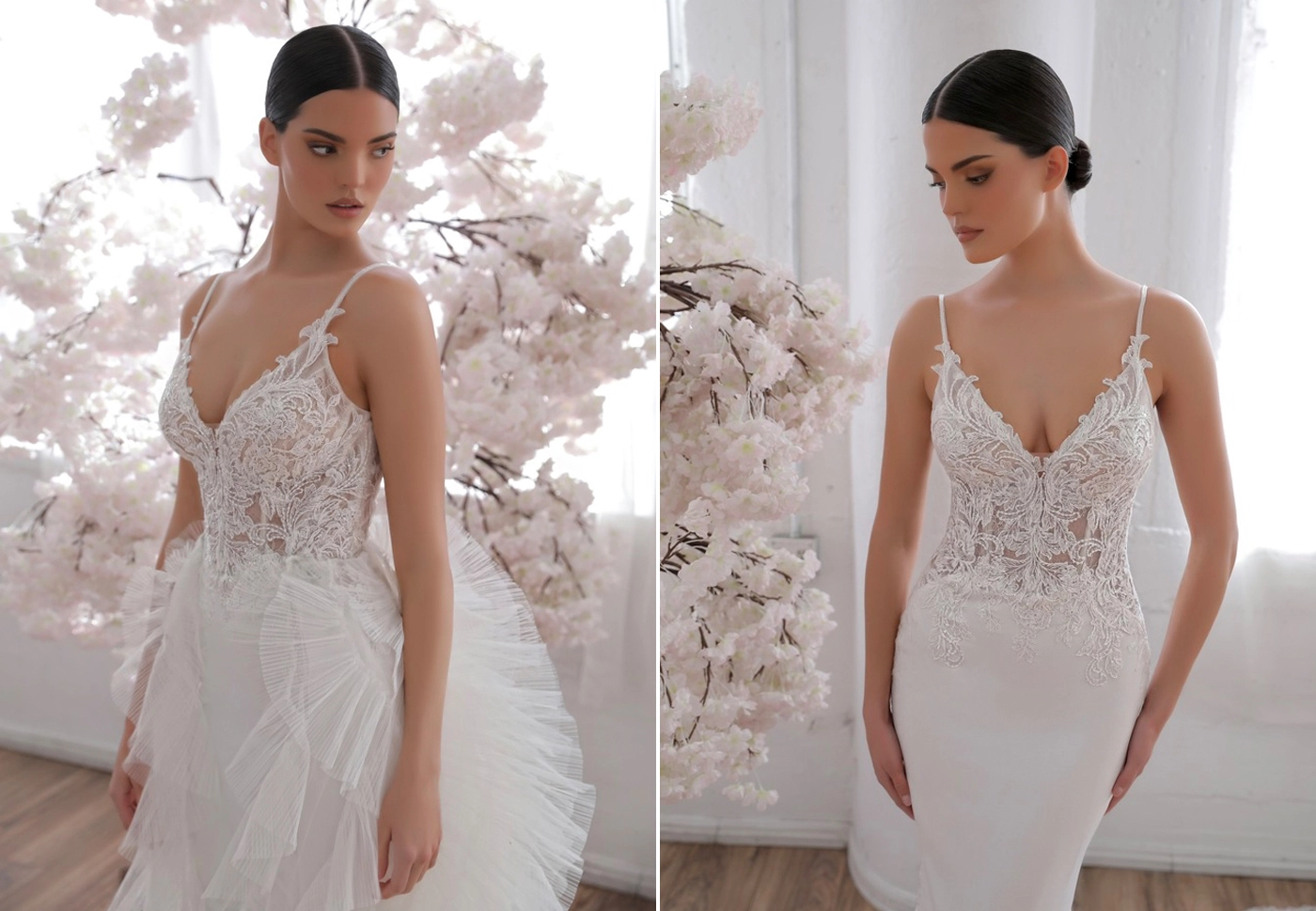 First up is the stunning and sexy Paris gown, featuring delicate hand-beaded slim straps. The drama of the bodice is beautifully balanced by the simple stretch georgette skirt. Float your gaze down and -- HELLO -- glistening embroidered lace train! The signature ÉLYSÉE sculpted hem works beautifully on Paris and delivers another heart stopping moment.