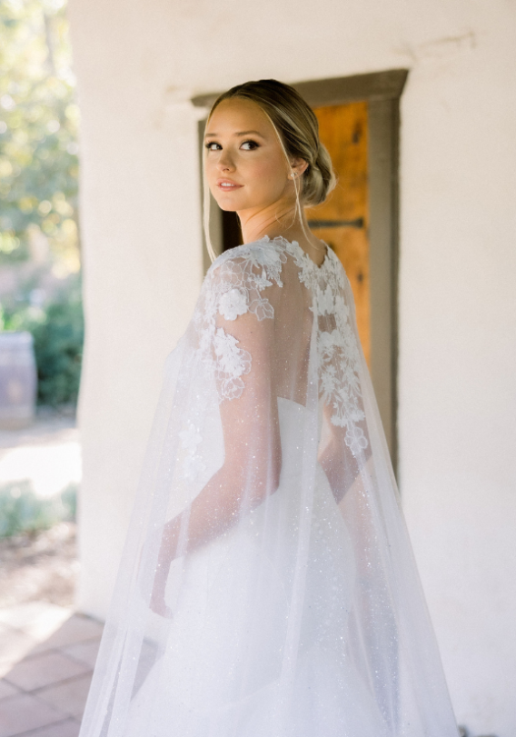 It's all about the lace and shimmer with our ROSELYN cape. The ROSELYN cape is an all-over sparkling cape with a romantic floral lace design on the shoulders. Similar to a removable jacket, this cape comfortably sits right on the shoulders without falling. The cape goes well with a super swirly lace gown like FRANÇOISE or a sleek Mikado gown like GIGI.