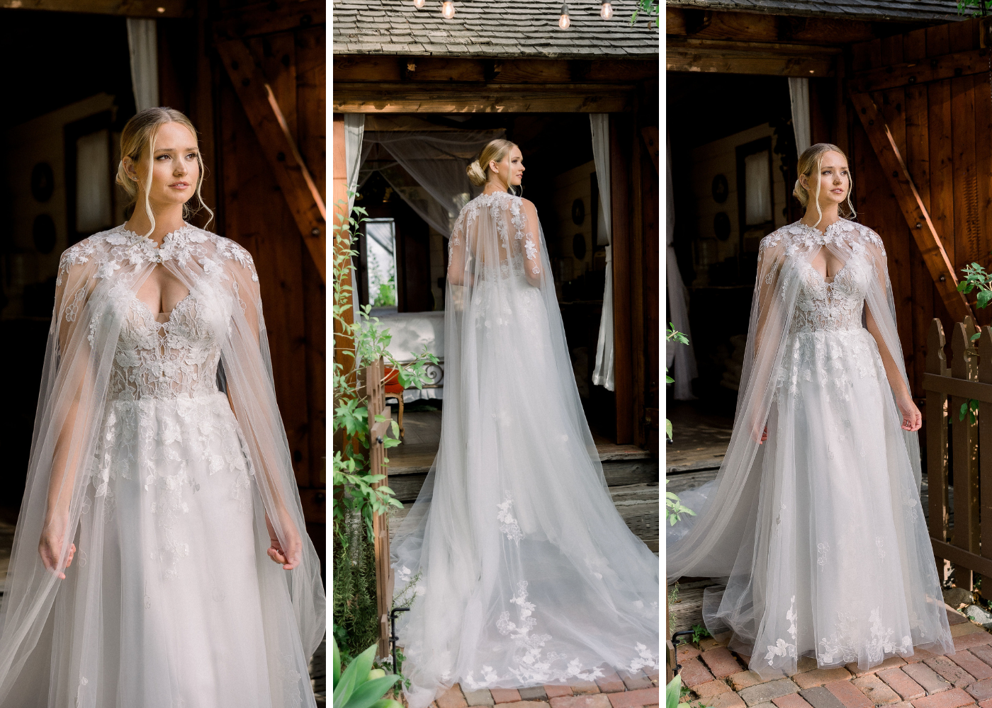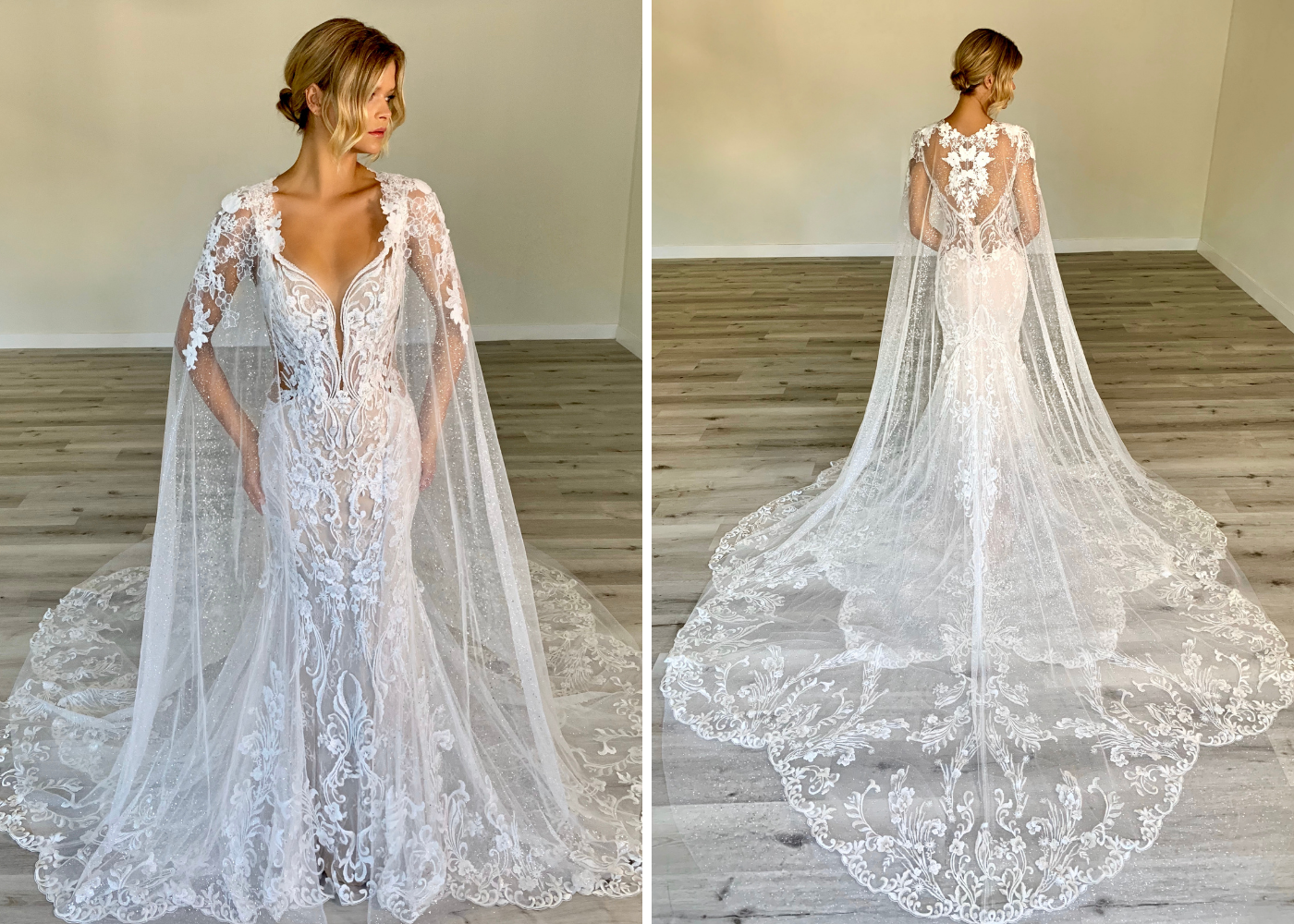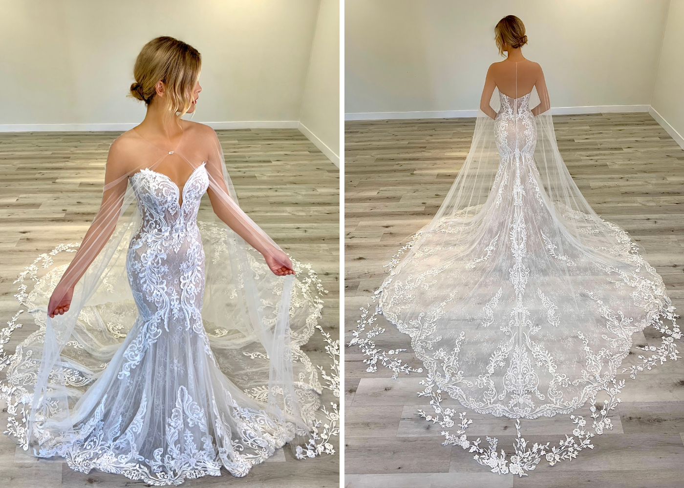 If a wedding veil isn't your cup of tea when it comes to your dream bridal style but you're still on the hunt for something romantic and dramatic, a cape could be a great alternative option. The VIVIENNE cape brings just the right amount of drama like a veil would, and looks chicly modern paired with any style of gown, such as an A-line wedding dress like PENELOPE (pictured above) or a mermaid wedding dress like ATHÉNAÏS (pictured left).