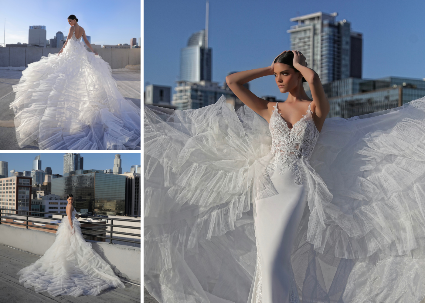 How about our EVANGELINE wedding dress shown here with our SABINE veil? Check out that breathtaking triple-sculpted hem train!